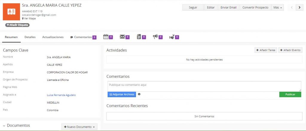 Actividades: Usted puede enlazar este prospecto a actividades tales como Llamadas, Reuniones o Tareas. Aquí consigue una lista de todas las actividades relacionadas con este Prospecto y puede crear nuevas actividades.