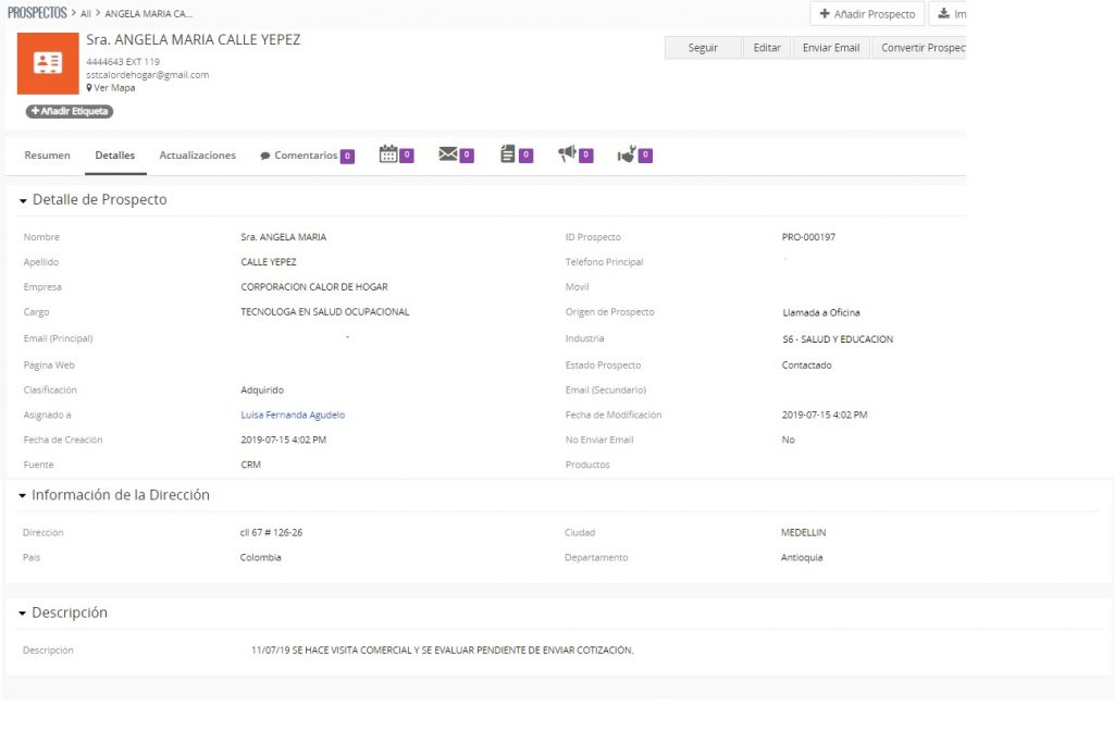 Actualizaciones: Podrá ver el histórico de todos los cambios realizados en el registro del Prospecto seleccionado, así como la información de quién y cuándo las efectuó.