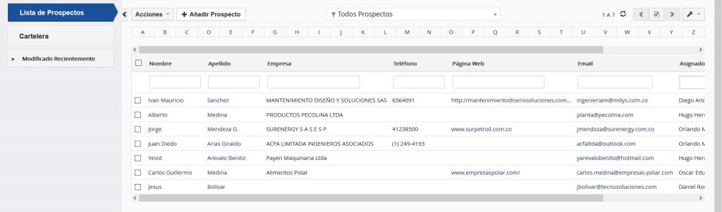 Si quiere encontrar un Prospecto en TecnoCRM o agregar información a un Prospecto existente, vaya al menú Prospectos en el área de navegación, donde se mostrará una lista con todos sus Prospectos existentes: