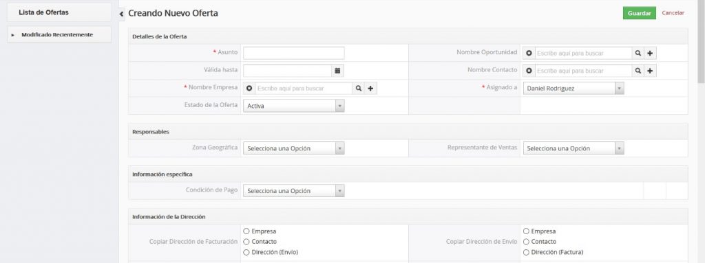 TecnoCRM le ayuda en la creación de las ofertas (cotizaciones) para los clientes potenciales. Usted puede utilizar una de las siguientes opciones: