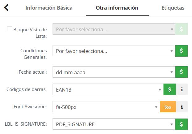 Como se muestra a continuación, la pestaña [Otra información] contiene varios campos. Hay opciones de bloqueo Vista de Lista, términos y condiciones, fecha actual, códigos de barras, código QR y funciones personalizadas.