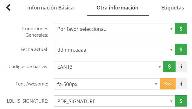 Como se muestra a continuación, la pestaña [Otra información] contiene varios campos. Hay opciones de Condiciones Generales, fecha actual, códigos de barras y funciones personalizadas.