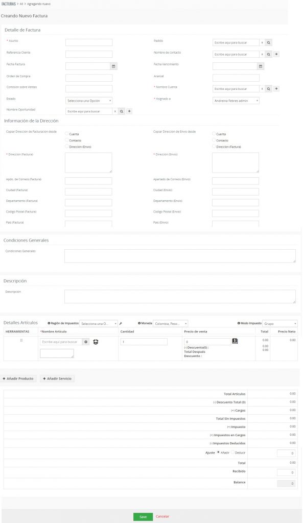 Usted puede utilizar el sistema TecnoCRM para crear las facturas de clientes. Haga clic en el ícono [+ Añadir Factura] en el menú de las Facturas ó, utilice preferiblemente [crear nueva factura] en el detalle de un Pedido.