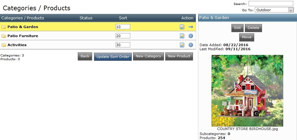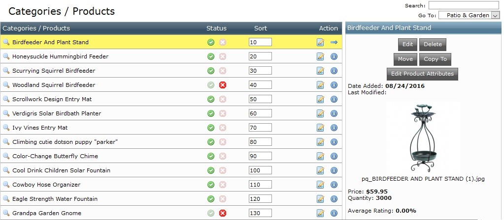 - Permite crear, modificar, eliminar, mover y/o copiar, productos en sus respectivas categorías y subcategorías.
