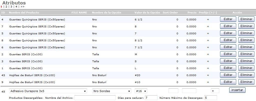 Al final de dicha lista, aparecen una serie de rectángulos (campos desplegables) que permiten crear los Productos con sus Opciones y Valores. El primer rectángulo contiene el nombre de todos los productos de la tienda (Nombre del Producto), debe seleccionar el producto para el cual se le quieren asignar los atributos. Con los dos rectángulos siguientes solo debe escoger la Opción y el Valor correspondiente a dicho producto. Posteriormente escriba el orden a ser listado, la diferencia de precio entre ese producto y sus atributos incorporados respecto al precio del producto base (dicho número se suma o resta al precio base del producto), y en el rectángulo final se debe colocar un “+” o “-“. Esto último determina si el sistema de la tienda sumará o restará el valor del atributo del precio escrito al precio base del producto (Nota: Vale decir que, cuando se crea un producto se le asigna el precio base, Ver: “Añadir un Nuevo Producto”). Finalmente, haga click en el botón “insertar”, y el atributo será asignado al producto. A su vez, cuando se trate de productos Software se deben llenar los campos de “Productos Descargables”, indicando el nombre del archivo (Nombre del Fichero), el tiempo de expiración (Días de Caducidad) y la cantidad máximas de descargas que puede hacer el cliente antes de su expiración (Máxima Cantidad de Descargas).