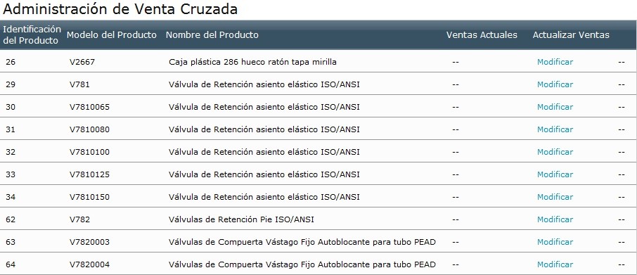 - Productos Venta Cruzada: Permite asociar a un producto específico otros productos que probablemente pueden ser necesarios para vender dicho producto, de esta manera el cliente puede tener una referencia completa de todo lo que necesita adquirir. El sistema muestra inicialmente un cuadro con un listado de todos los productos configurados en la tienda, los productos que están asociados a cada uno y luego las opciones de modificar / ordenar. Para asociar productos a uno específico, se debe hacer clic en “Modificar” y aparece una nueva página que permite marcar o seleccionar los productos a asociar, una vez marcados se debe hacer clic en “actualizar”.