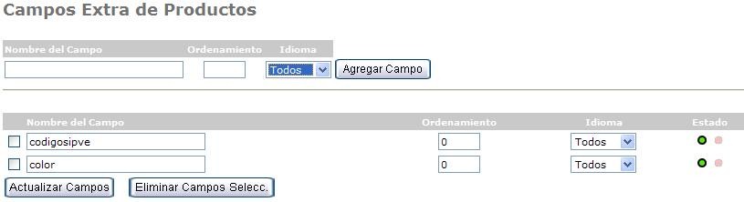 - Campos Extra de Productos: Permite agregar campos en el formulario de configuración de productos (Extra Fields), en caso de requerirlos. Para tal fin, solo se debe escribir el nombre del nuevo campo, definir el orden, el idioma y hacer clic en Agregar Campo. Una vez creados, estos pueden ser editados o eliminados, activados o desactivados.