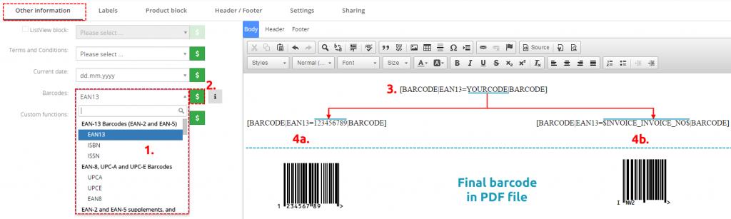 Reemplace “YOURCODE” con un número / cadena estática (4a) para hacer el código de barras o puede usar las variables de la plantilla real (4b).