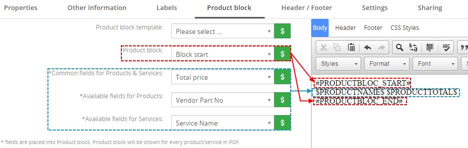 Agregue todos los campos necesarios de productos / servicios de acuerdo con sus necesidades entre (#PRODUCTBLOC_START#) y (#PRODUCTBLOC_END#) y proporcione el formato si es necesario.