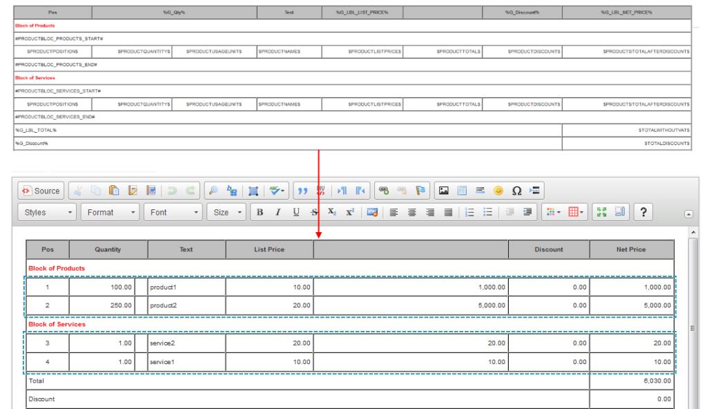 - Agregue todos los campos de productos / servicios necesarios de acuerdo con sus necesidades entre (#PRODUCTBLOC_PRODUCTS_START# o #PRODUCTBLOC_SERVICES_START#) y (#PRODUCTBLOC_PRODUCTS_END# o #PRODUCTBLOC_SERVICES_END#) y proporcione formato si es necesario.