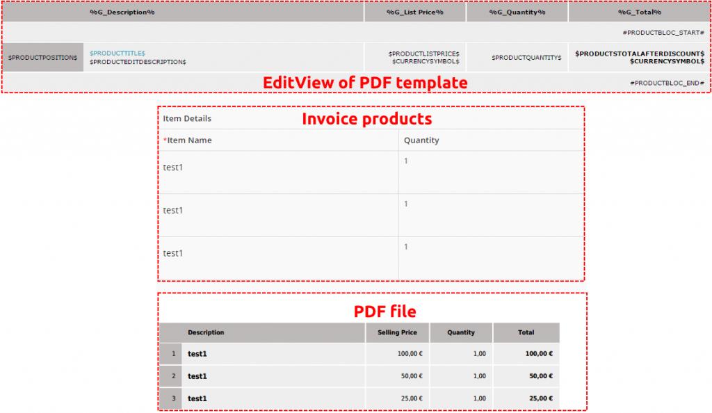 Los bloques de productos son partes simples pero poderosas de sus plantillas PDF. Se utilizan para mostrar todos los productos / servicios de los módulos Facturas, Cotizaciones, Pedidos (Orden de venta) y Orden de compra en sus archivos PDF, independientemente de la cantidad de productos / servicios para un registro en particular. A continuación, puede encontrar un ejemplo simple en el que la factura contiene tres productos que se ven automáticamente en el archivo PDF exportado final. No es necesario crear una plantilla para tres filas en la tabla, simplemente defina el inicio y la parada del bloque de producto y los campos de producto de acuerdo con sus necesidades. En una sección más adelante describimos cómo crear su propio bloque de productos. Además, también presentamos algunas plantillas de bloques de productos predeterminadas, así como una herramienta para administrarlas.
