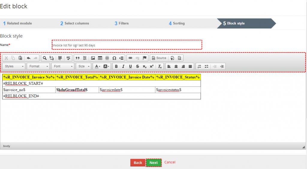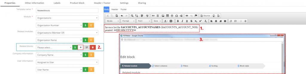 Como puede ver en la imagen a continuación, puede simplemente insertar, crear, editar o eliminar bloques relacionados usando los botones en la pestaña Propiedades. Cómo crear un bloque relacionado se mostrará en un ejemplo basado en el módulo “Organizaciones”. Supongamos que nos gustaría crear una plantilla PDF simple basada en el módulo “Organizaciones”, y necesitamos enumerar todas las facturas para una organización en particular que se crearon en los últimos 90 días. Para hacerlo: