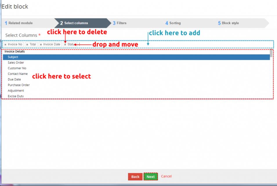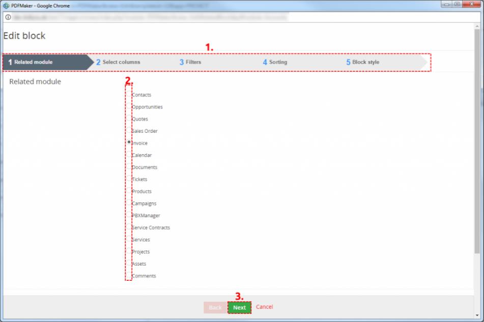 Como puede ver en la siguiente imagen, son necesarios 5 pasos para crear el bloque relacionado. En esta ventana también se muestran todos los módulos de entidad relacionados para el módulo principal. El primer paso es seleccionar un módulo relacionado de la lista disponible (1.). Seleccione “Factura” y haga clic en el botón ![]()