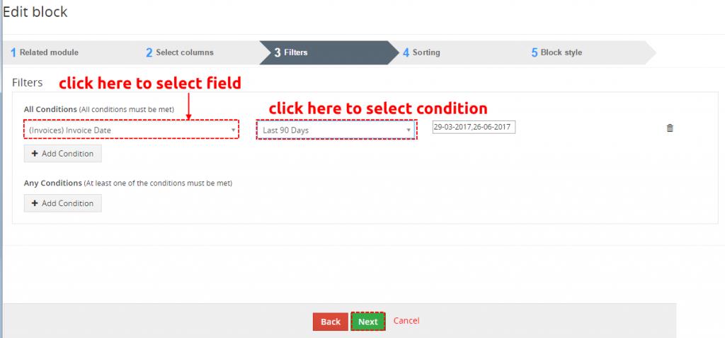 En el paso 3, podemos especificar las condiciones para filtrar los resultados en la plantilla. Podemos especificar condiciones en filtros estándar o avanzados. Los filtros estándar tienen campos como los campos de fecha y hora, mientras que los filtros avanzados tienen todos los campos de los módulos seleccionados donde el comparador y la condición se pueden elegir según el tipo de campo seleccionado.
