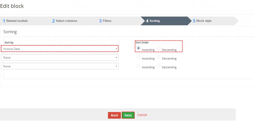 En el paso 4, defina los campos utilizados para la clasificación y el tipo de clasificación, es decir, clasificación ascendente o descendente. Puede definir más campos para ordenar. Continúe con el paso final a través del botón ![]()