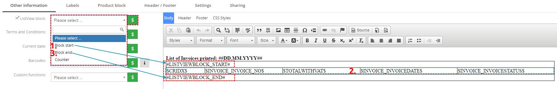 - Inserte los campos que le gustaría tener en el bloque de vista de lista ($s-invoice-invoice_no$ ..).