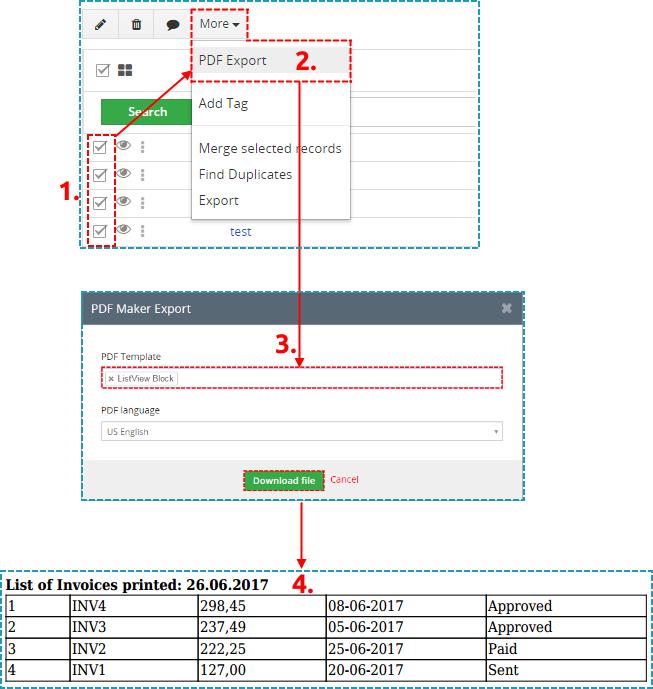 En caso de que necesite un archivo PDF que conste de varios registros y algunos campos relacionados, puede utilizar el bloque de vista de lista. Dentro de este bloque, simplemente puede establecer qué campos de los registros le gustaría tener. Consulte la imagen a continuación que muestra un ejemplo simple del archivo PDF que consta de la lista de facturas y algunos campos relacionados (número de factura, fecha de factura, estado, etc.) y cómo prepararlo.