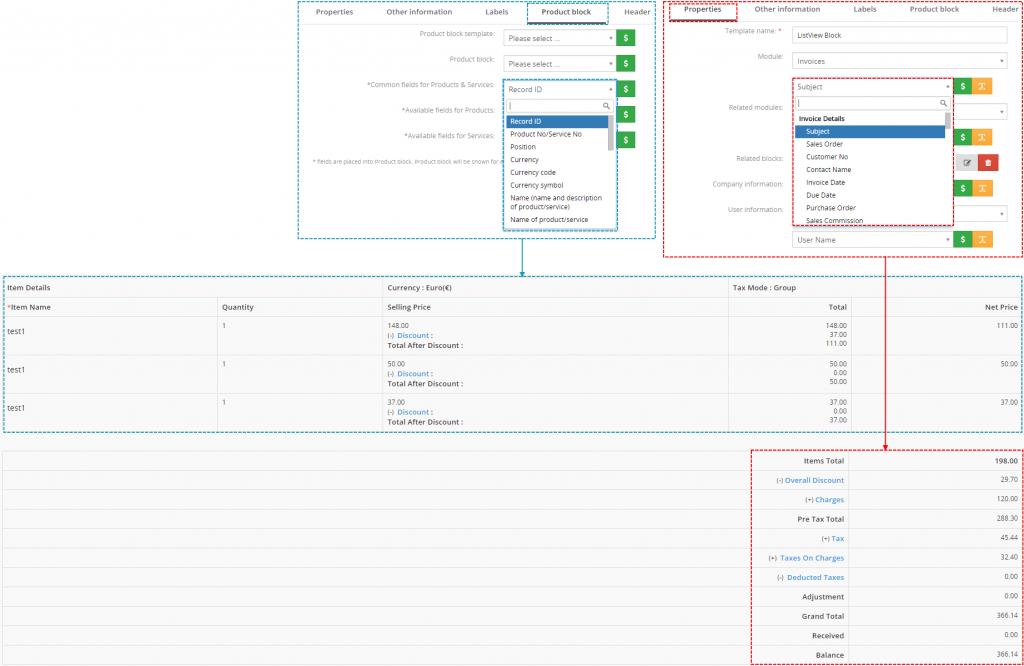 Asignación de valores para el artículo de plantilla de bloque de producto disponible en facturas, cotizaciones, órdenes de venta y órdenes de compra: