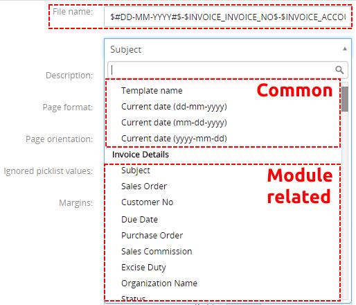 En la pestaña Configuración del Creador de PDF puede encontrar la definición de “Archivo”. Esta configuración le brinda la oportunidad de establecer el nombre de los archivos PDF generados de acuerdo con sus necesidades. Puede combinar cadenas, variables de módulos y algunas variables estándar como Nombre de plantilla, Fecha actual. El nombre del archivo se utilizará guardando el archivo PDF en Documentos y también enviando PDF como archivo adjunto. La lista desplegable para el nombre del archivo depende del módulo principal, como se puede ver en la siguiente imagen: