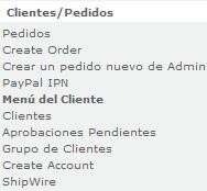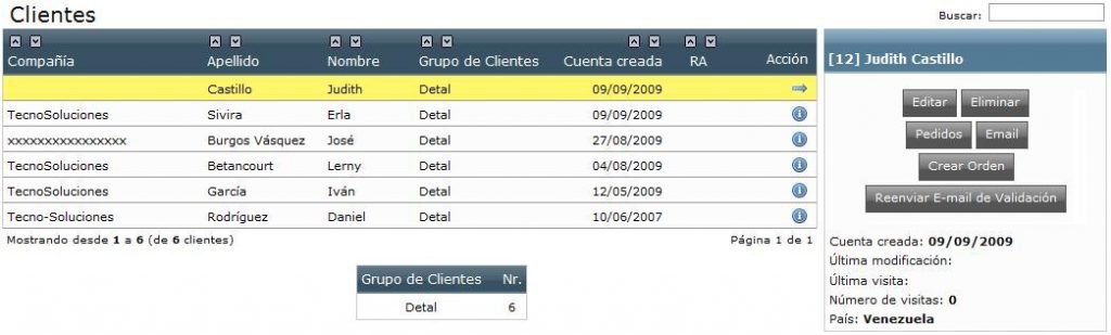 - Clientes: Presenta un listado de los clientes registrados, con datos como: Apellido, nombre y fecha en la que fue creada la cuenta, cada uno puede ser ordenado en forma ascendente o descendente. Además, por cada cliente se tienen 4 opciones principales: Editar (los datos del cliente), eliminar (al cliente del sistema), pedidos (lista los pedidos realizados por el cliente) y email (el Administrador puede enviar un email directamente a un cliente en específico). A su vez, indica un reporte del número de grupos de clientes creados. Cada opción es bastante directa y se explica por sí sola.