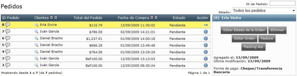 - Pedidos: Está conformado por un listado de los pedidos registrados en la Tienda por clientes y por cada uno datos como: Total Pedido, Fecha y hora de la Compra, Estado del Pedido y las opciones para editar (estatus de la orden y la orden completa), eliminar orden, mostrar / imprimir factura y mostrar / imprimir Etiqueta / Lista Paq. (Lista de Empaque), el manejo de estas opciones son similares a las ya descritas en este manual. Vale decir que debido a que es una lista de pedidos, aparecerá el nombre del cliente tantas veces como pedidos tenga.