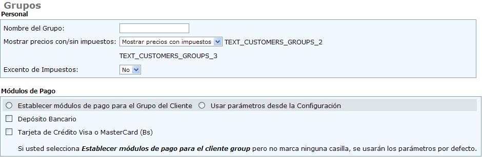 Para crear un grupo se debe hacer clic en “insertar” y llenar el formulario correspondiente, determinando el nombre del grupo, si los precios se van a mostrar con impuestos o si van a estar exentos, si se establece el módulo de pagos y el de despachos o los parámetros de configuración normales.