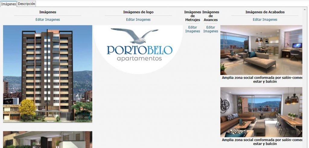 Imágenes: Como mencionamos anteriormente, acá podrás agregar o editar todas las imágenes del proyecto que desees, según las categorías. Además, del logo y el pin del proyecto.
