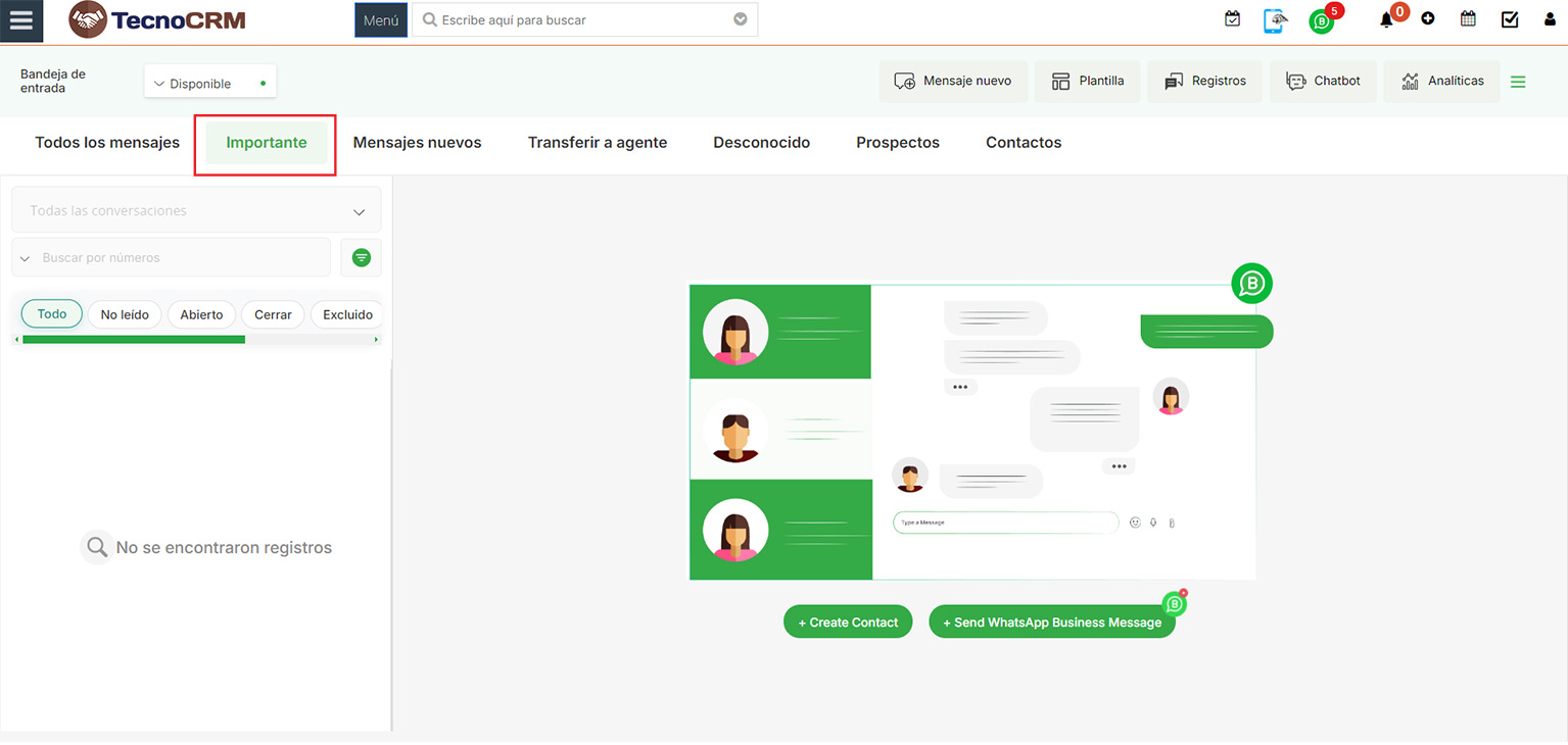 La sección de mensajería “Números desconocidos” tiene la misma opción que enviar/recibir mensajes a registros individuales. Desde Número desconocido hay una opción para crear un nuevo registro de cliente o actualizar “Número desconocido” a un registro existente en TecnoCRM.