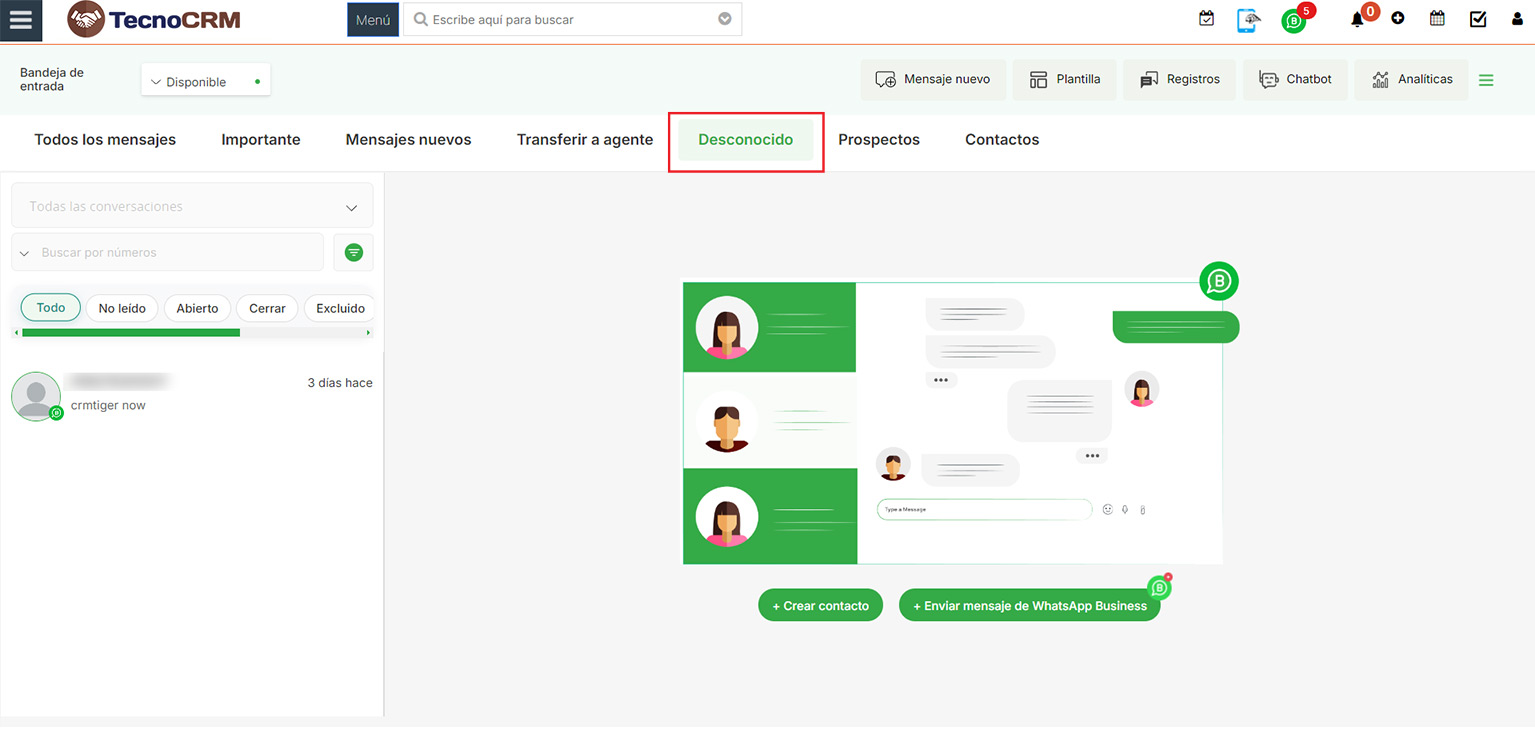 Los “Números desconocidos” en el área de mensajes globales de WhatsApp Business enumeran todos los mensajes de un “número desconocido” que no está almacenado como registro en CRM.