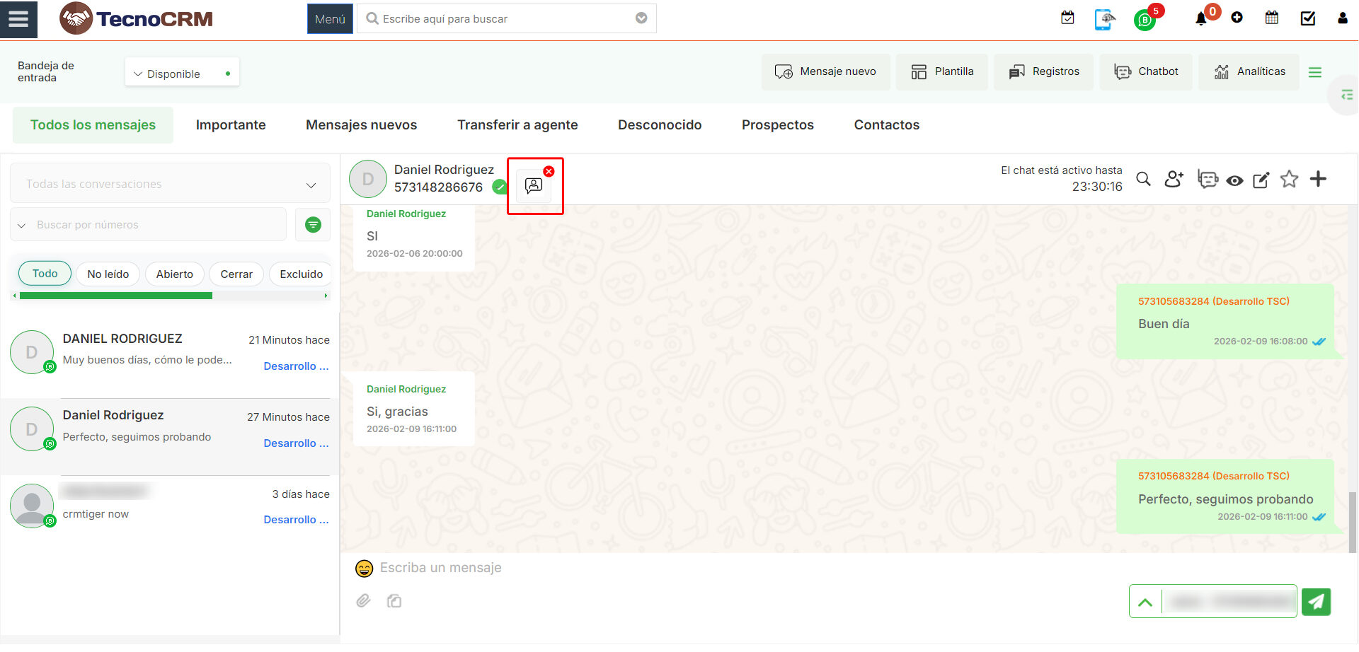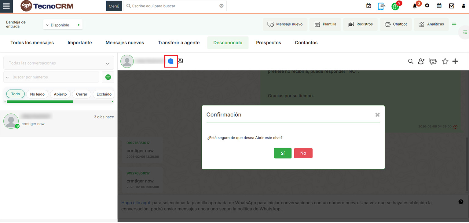 Para reabrir la conversación, haz clic en el icono azul. Aparecerá un cuadro de diálogo de confirmación preguntándote si quieres reabrir el chat. Haz clic en “Sí” para confirmar y reabrir la conversación.