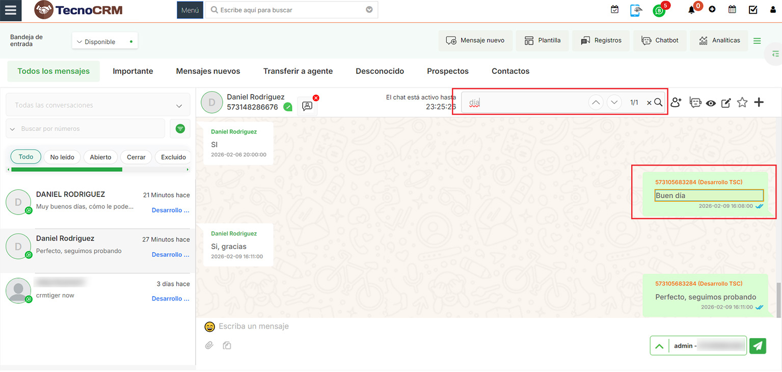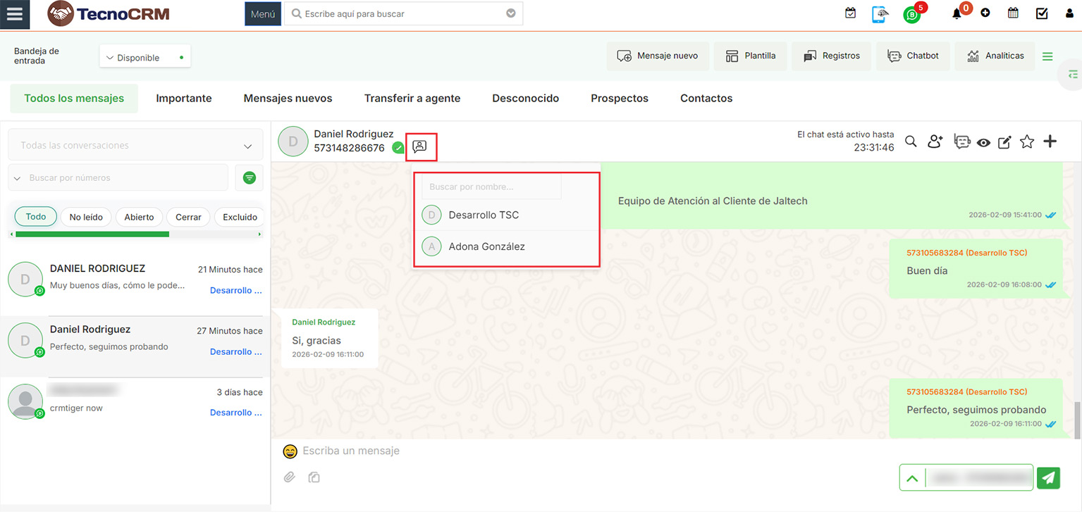 Hay disponible un filtro de chat por usuario que permite ver los chats específicos de un usuario seleccionado. Por ejemplo, si varios usuarios han interactuado con el mismo contacto, se mostrarán todos los mensajes de todos ellos a menos que se aplique el filtro. Al seleccionar un usuario específico, solo se mostrarán los mensajes enviados por él.