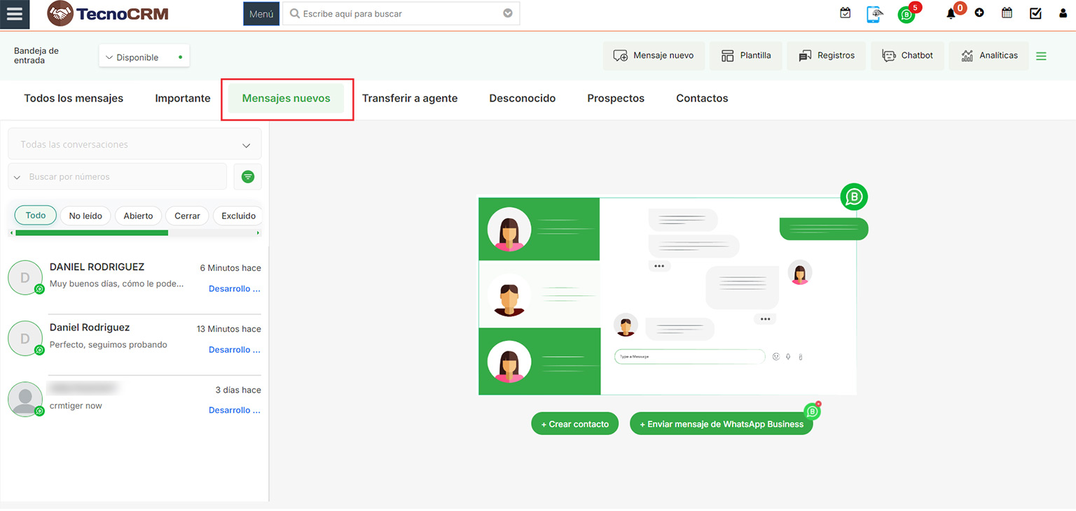 En los mensajes globales de WhatsApp Business, la lista del área de Mensajes nuevos muestra todos los mensajes no leídos, ya sea de un “número desconocido” o de “registros de contactos existentes”.
