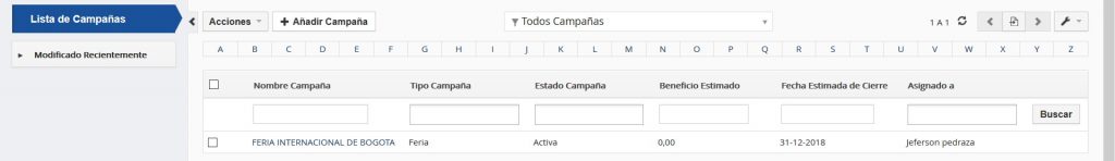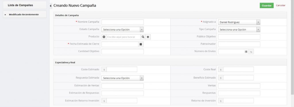 TecnoCRM le asiste en sus esfuerzos de comercialización con un módulo para el manejo de sus campañas de mercadeo. Haga clic en la opción del menú [Campañas].