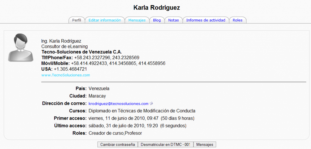 Pestañas: Editar información, Mensajes, Blog, Notas, Informes de actividad, Roles.