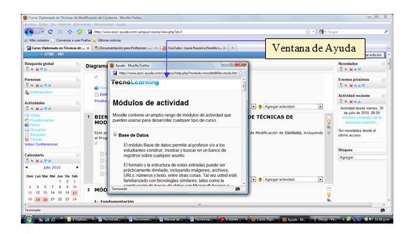 Es una documentación breve que ofrece el programa, con el objeto de ofrecer información sobre puntos específicos, guiando al usuario; con el objeto de aclarar posibles dudas de uso de la plataforma de TecnoLearning. Ellas se ubican al lado de las ventanas de los bloques de información, actividades y recursos. Al hacer clic en éste icono, muestra la ayuda en una ventana emergente