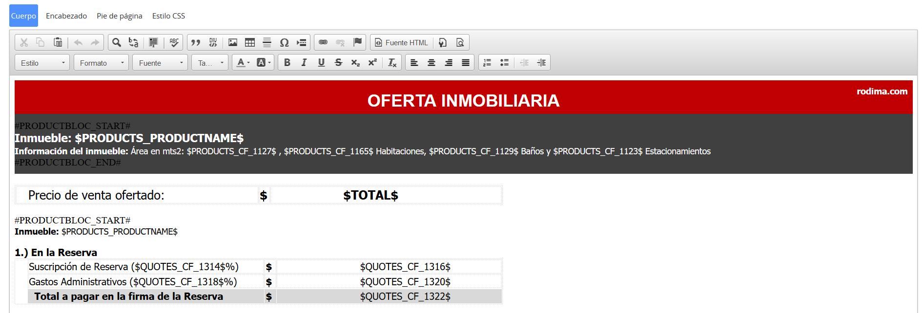 Como se puede ver en la imagen a continuación, para tener una plantilla PDF útil, puede combinar: su propio texto, campos de módulo o campos de módulo relacionados, imágenes, tablas, códigos de barras, etiquetas, plantillas de bloques de productos, bloques relacionados, etc. dentro del área de edición debajo de las pestañas Cuerpo / Encabezado / Pie de página, y comience a escribir su texto. Puede continuar agregando campos adicionales. Las pestañas Cuerpo / Encabezado / Pie de página le permiten cambiar el formato de su texto y otros campos insertados usando muchas barras de herramientas. Simplemente seleccione el texto / campo y haga clic en cualquier icono de la herramienta como fuente, color, negrita, cursiva, alineación, etc.