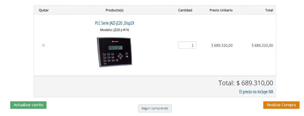 Cuando el cliente tiene productos en el carrito de compras, puede hacer una revisión del mismo ingresando como Usuario Registrado y haciendo clic en “Carrito”. Dicha página le permite editar sus pedidos: quitar un producto y/o cambiar la cantidad, es importante destacar, que cada vez que se realice un cambio se debe presionar el botón “Actualizar Carrito” para que se haga el registro correspondiente. También puede “Seguir Comprando” productos o, si ya el pedido está completo, formalizar el mismo (“Realizar Compra”). Ejemplo: