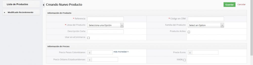 Categoría de Producto: Puede seleccionar aquí una categoría para su producto. Observe que el administrador de TecnoCRM puede modificar la lista de la selección.