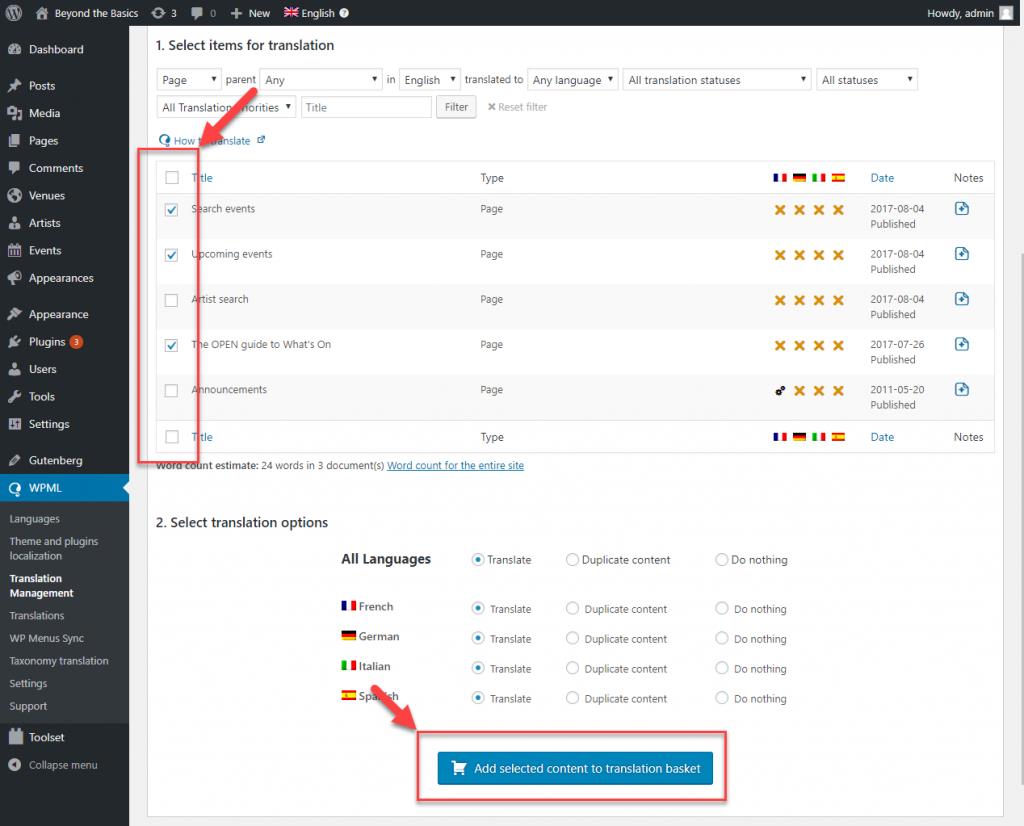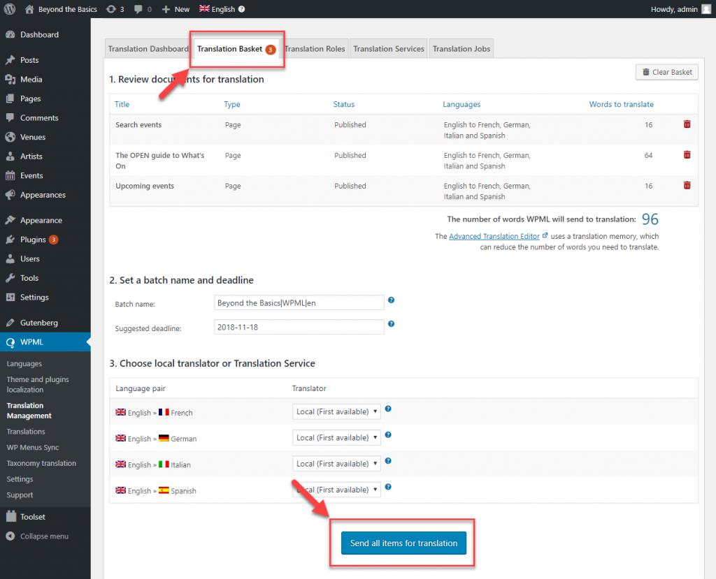 - Ir a la pestaña del Canasto de traducción y hacer clic para enviar el contenido seleccionado para traducción.