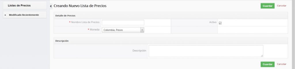Al ingresar para crear una nueva lista de precios, debe proveer a dicho libro de precios un nombre único. Puede además agregar una descripción para su referencia futura. Marque la casilla [Activo] si quiere que este libro de precios esté disponible para las ofertas/cotizaciones, órdenes y facturas. Recuerde hacer clic en [Guardar] para crear su nuevo libro de precios en el sistema TecnoCRM.