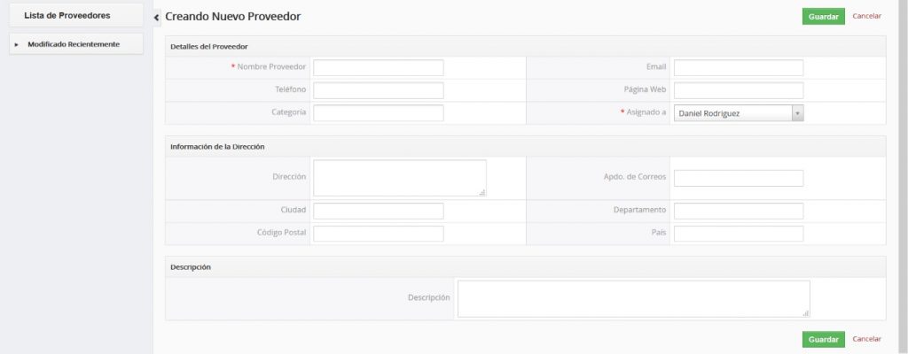 TecnoCRM permite que usted incorpore un número ilimitado de proveedores que proporcionen mercancías o servicios a su compañía o a sus clientes. Estos proveedores se almacenan por separado y no forman parte de las listas de contactos o cuentas.