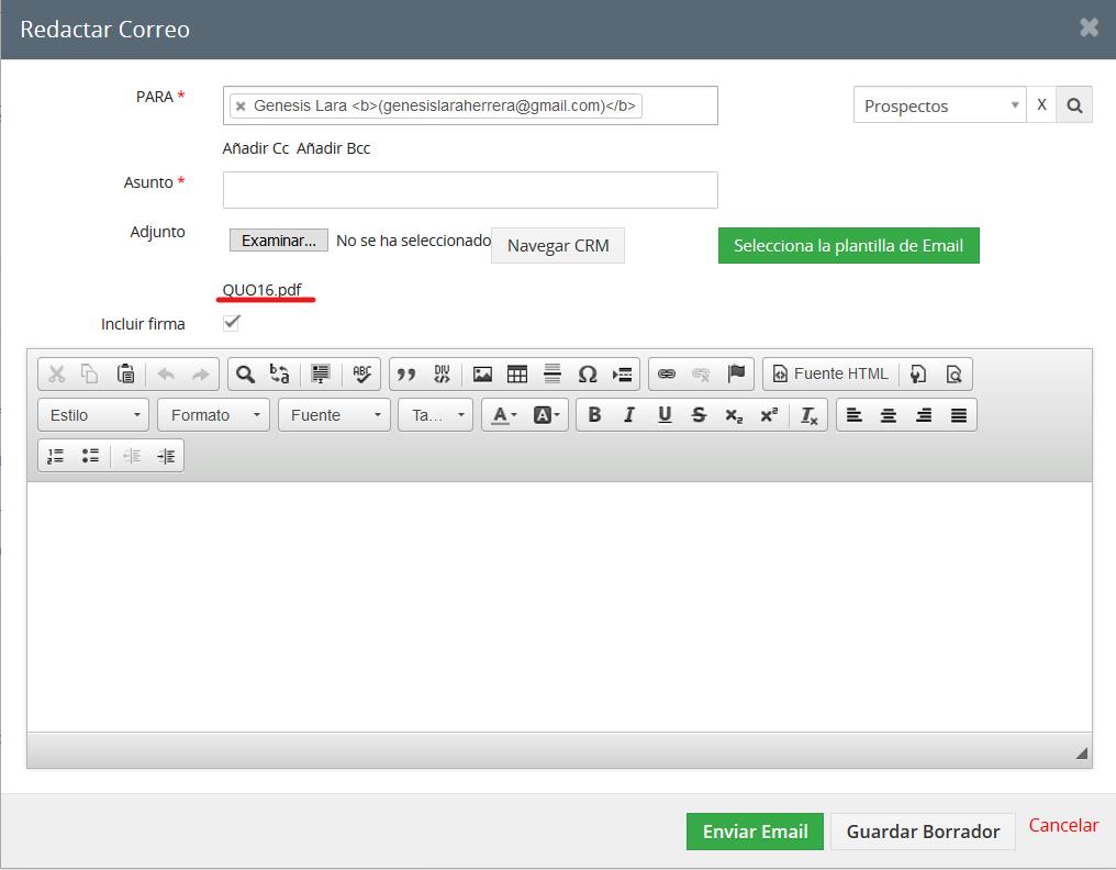 - Aparecerá una ventana emergente “Redactar Correo” en la pantalla con el archivo PDF ya adjunto. Agregue el tema y el texto según sus necesidades. También puede agregar destinatarios adicionales si es necesario.