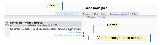 En el que aparen los mensajes de texto recibidos. Al hacer clic en la palabra Editar podrá modificar únicamente el mensaje escrito por usted. Al hacer clic en la palabra Borrar, eliminará el mensaje. Al hacer clic en la frase Ver el mensaje en su contexto…… se abrirá el siguiente recuadro (Fig. 15).