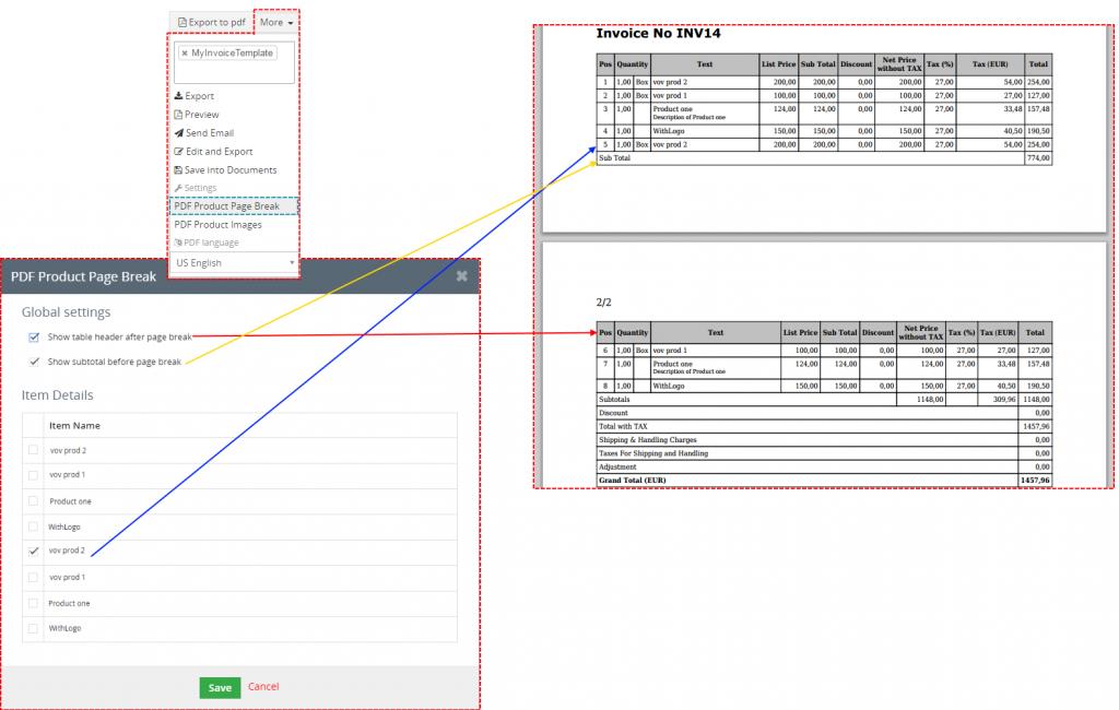 Los bloques de productos están disponibles para algunos módulos (Factura, Pedidos, Órdenes de Compra, Cotizaciones). La acción de salto de página del producto PDF le permite realizar configuraciones adicionales según sus necesidades. Puede definir: