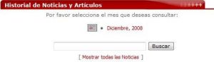 Archiva todos los artículos / noticias por meses, permitiendo una consulta cronológica, bien sea seleccionando el mes correspondiente o haciendo uso del motor de búsqueda interno. Tras haber elegido el mes, se muestran los artículos correspondientes. En este plano se puede ver el artículo en versión imprimible o enviárselo a un amigo, además muestra detalles sobre cada artículo como: