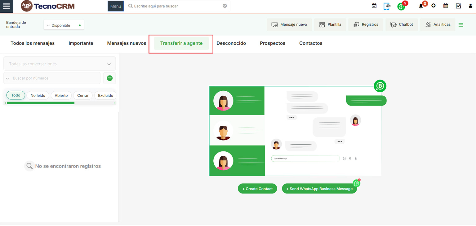 La función “Transferir a agente” muestra todos los chats que se han transferido del chatbot a un agente en vivo, lo que permite que cualquier agente disponible tome el control y continúe la conversación con el usuario.