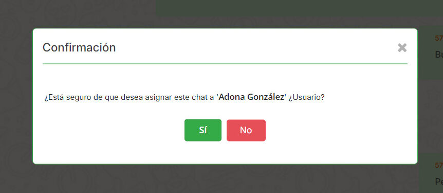 Al hacer clic en cualquier usuario, se abrirá una ventana emergente que solicitará confirmación para asignar el chat al usuario seleccionado. Haga clic en “Sí” para asignar todo el chat al usuario elegido.