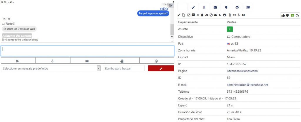Al hacer clic sobre el chat activo (el Visitante que está en Línea), se abre el ambiente donde el Operador puede interactuar con el Visitante: