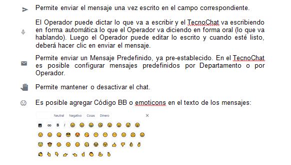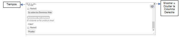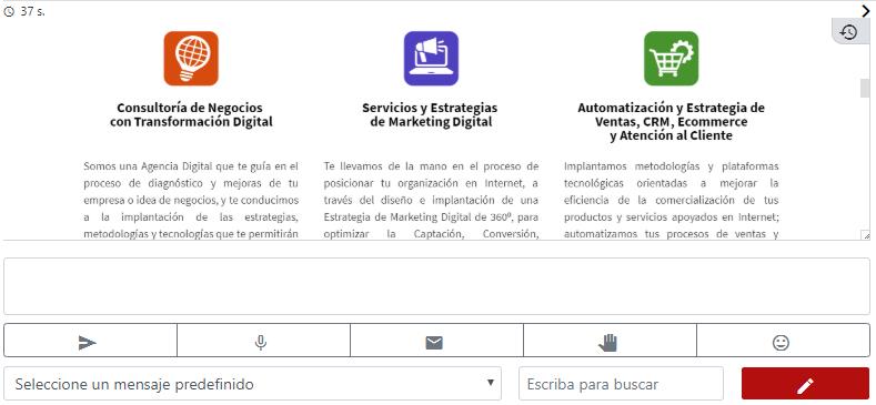 - Cuadro de Diálogo: Área con la conversación en vivo. Mantiene el histórico de la conversación indicando el tiempo de la conversación y el tiempo transcurrido del último mensaje.