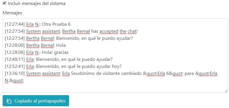 Muestra en una ventana toda la conversación sostenida con el Visitante, con la opción de si se desean agregar los mensajes del sistema cuando ha existido algún cambio (como por ejemplo, un cambio en el Atributo del Visitante). Al hacer clic en “Copiado al portapapeles”, toda la información está lista para ser copiada en cualquier parte.